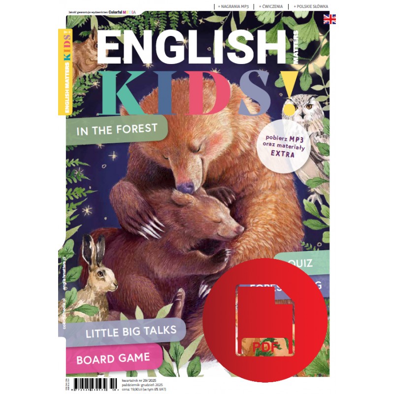 Drodzy Czytelnicy,Numer 29 magazynu English Matters Kids zabierze Was w niezwykłą podróż do lasu. Spotkacie wyjątkowe zwierzęta, poznacie sekrety natury i przekonacie się, że odwaga kryje się w codziennych sytuacjach. Czekają na Was historie, zagadki, zabawy i graplanszowa, które sprawią, że nauka angielskiego stanie się jeszcze ciekawsza. Jak zawsze, zapraszamyna stronę www.emkids.pl, gdzie znajdziecie pliki MP3, dodatkowe ćwiczenia oraz filmy. Nagrania możecie też odtworzyć, skanując kody QR smartfonem. Otwórzcie ten numer i wyruszcie razem z nami w pełną odkryć leśną przygodę!
